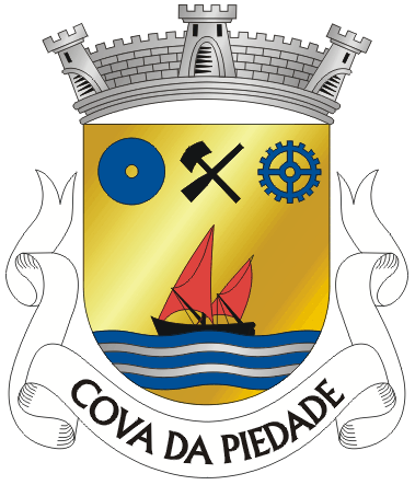 Armas - Escudo de ouro, barco dos moinhos de negro, aparelhado do mesmo, vestido de vermelho e vogante sobre um ondado de azul e prata; em chefe um maço e um assentador de tanoeiro, ambos de negro e passados em aspa, entre uma mó de moinho e uma roda dentada, ambas de azul. Coroa mural de prata de três torres. Listel branco com a legenda a negro: "COVA DA PIEDADE".